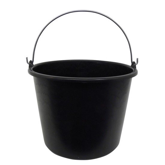 Sort bøtte i kraftig plast med bærehank.
