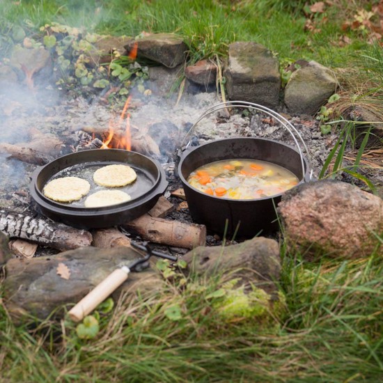 Den har et solid fotfeste i eller oppå bålet takket være de tre benene. Den kan eventuelt henges over bålet ved hjelp av kroken på håndtaket.