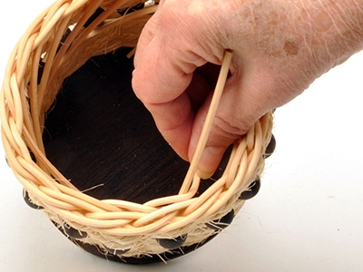 Sjekk at lengden passer, så den går ca. 1 cm bak den andre staven. Sett en stav til i bunnen og gjenta. Fortsett hele veien rundt.