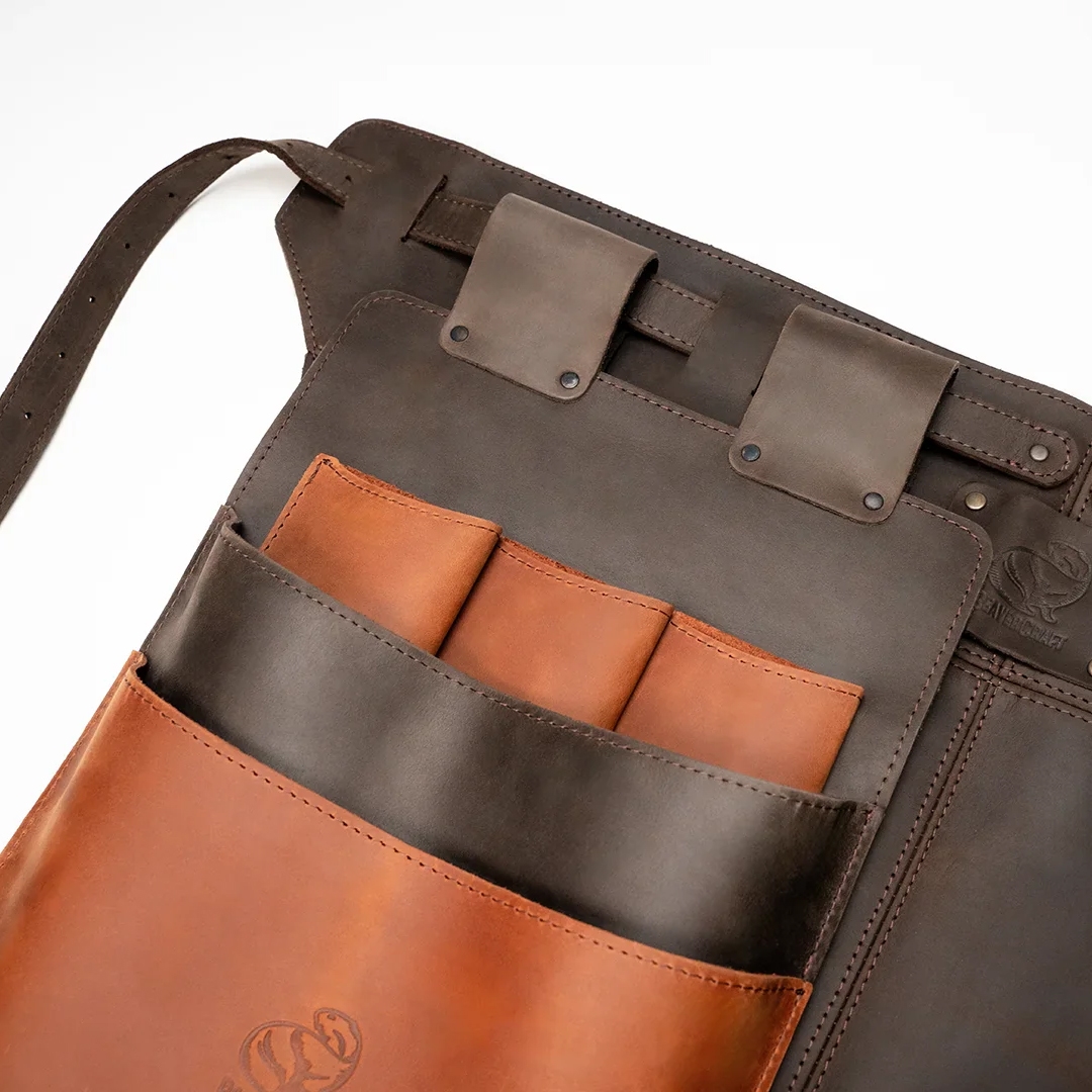 Opplev den perfekte kombinasjonen av stil og funksjonalitet med Leather Work Apron og Tool Belt Pouch Set – et sett laget i høykvalitets “crazy horse”-lær.