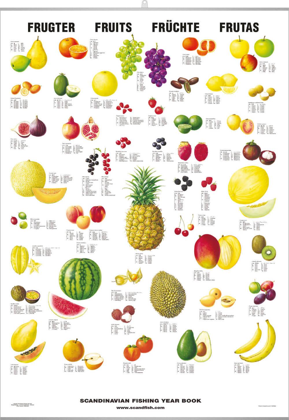 Plakaten på 70 x 100 cm trykkes på kraftig glansfult papir (170 g) som deretter laminerers, dvs. overflatebehandlet slik at den kan tørkes av. Navnene på fruktene er angitt på følgende språk: kinesisk (tegn), tysk, dansk, spansk, fransk, engelsk, italiensk, japansk (tegn), norsk, nederlandsk, russisk (kyrilliske og latinske tegn), svensk og tyrkisk.