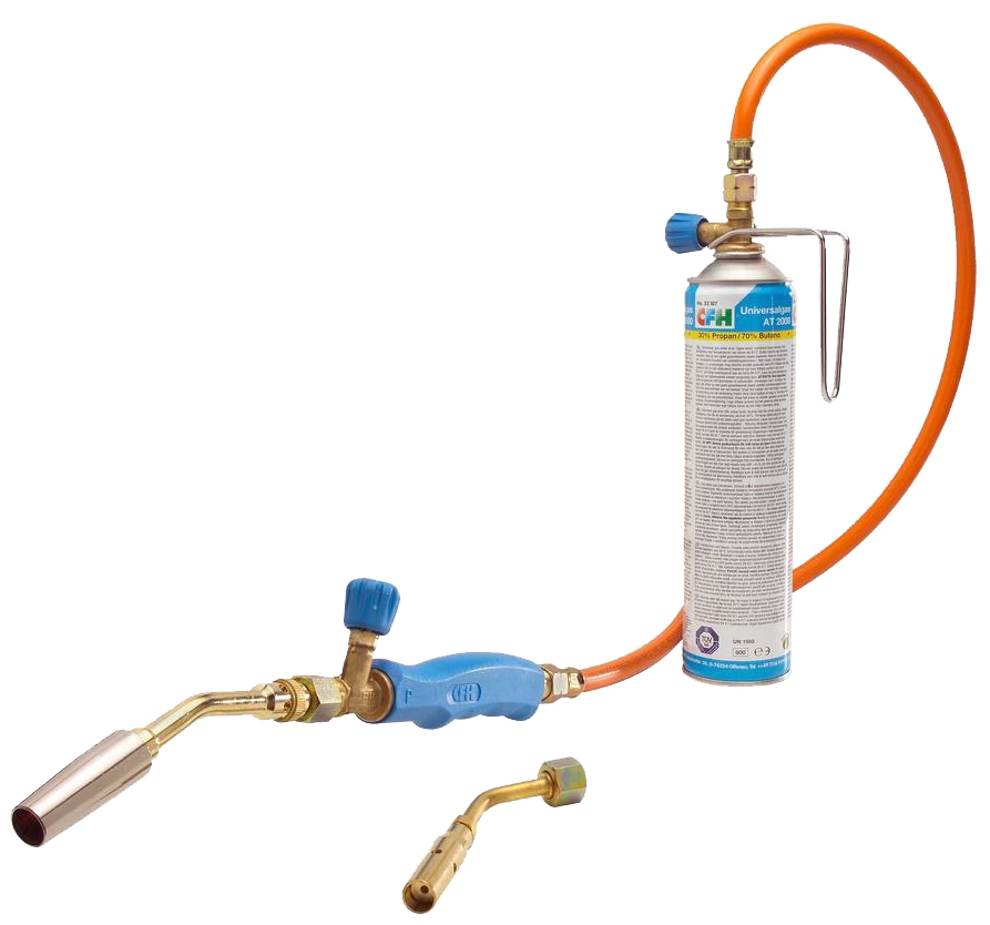 Utstyrt med kraftig turbobrenner på Ø20 mm og spesiell loddbrenner på Ø14 mm til sveiselodding. Kan kobles til dem medfølgende 330 g gassflasken og alle vanlige propan-butan gassflasker