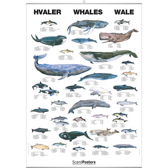 Fin hvalplakat fra ScandPosters med 33 av de vanligste hvalene og delfinene i verden. Alle hvalartenes mål og vekt er angitt, og navnene deres er skrevet på 13 språk. En fin læringsplakat til barnerommet eller en oversiktsplakat i skolens biologirom, hvor elevene kan se likheter og forskjeller mellom de ulike hvalartene. Også en fin gave til den nyutdannede marinbiologen.