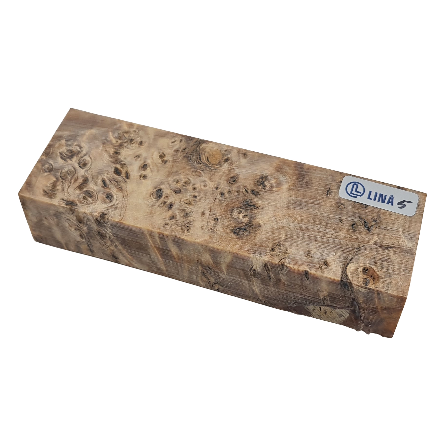 Dette treemnet er et Masterpiece, spesielt utvalgt på grunn av sine usedvanlig vakre mønstre og farger. Emnet er laget av poppelknute, som allerede er kjent for sin dekorative og livlige årestruktur med naturlige knuter og variasjoner, men akkurat denne klossen skiller seg ut med et ekstraordinært spill i både kontraster og dybde. Knutedannelsene gir et uttrykk som er helt unikt, og materialet egner seg derfor spesielt godt til prosjekter der estetikken står i sentrum – som eksklusive knivskaft, smykker eller håndtak der man ønsker noe helt spesielt.