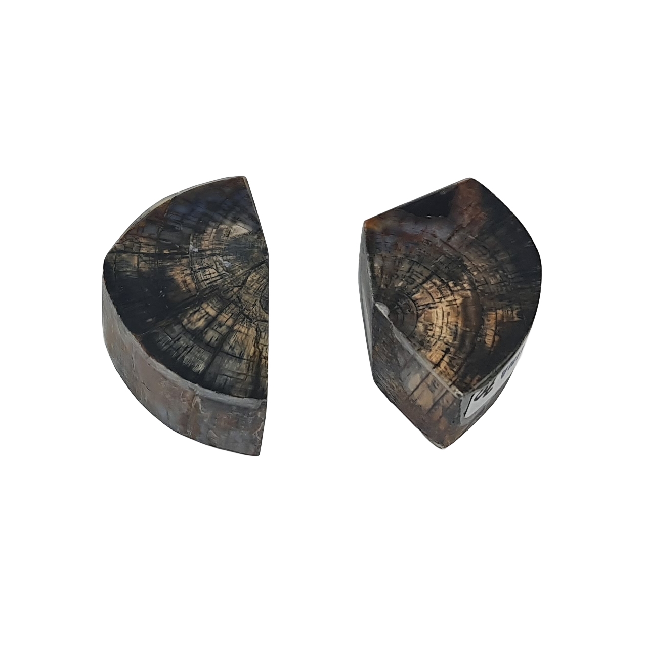 Dette settet inneholder to matchende biter av mammutstøttann, nøye utvalgt for både farge og mønster, noe som gjør dem velegnet som for- og bakholk til knivskaft. Alternativt kan de brukes individuelt til to separate kniver.