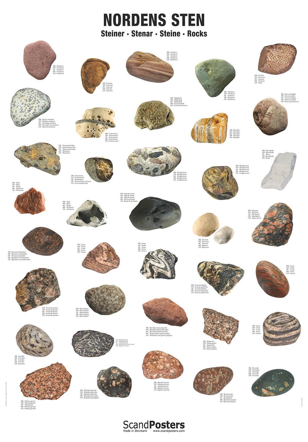Flott, 70 x 100 cm stor, plakat med 37 av de mest vanlige steinene du finner i Norden. Detaljerte og i naturlige farger – slik at du enkelt kan sammenligne og gjenkjenne steinene du finner i naturen Plakaten er UTEN metalister i topp og bunn. Noe som betyr at du, med denne varianten av plakaten, kan sette den inn i en ramme.