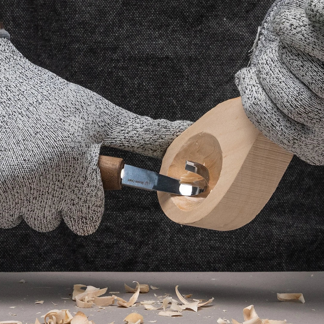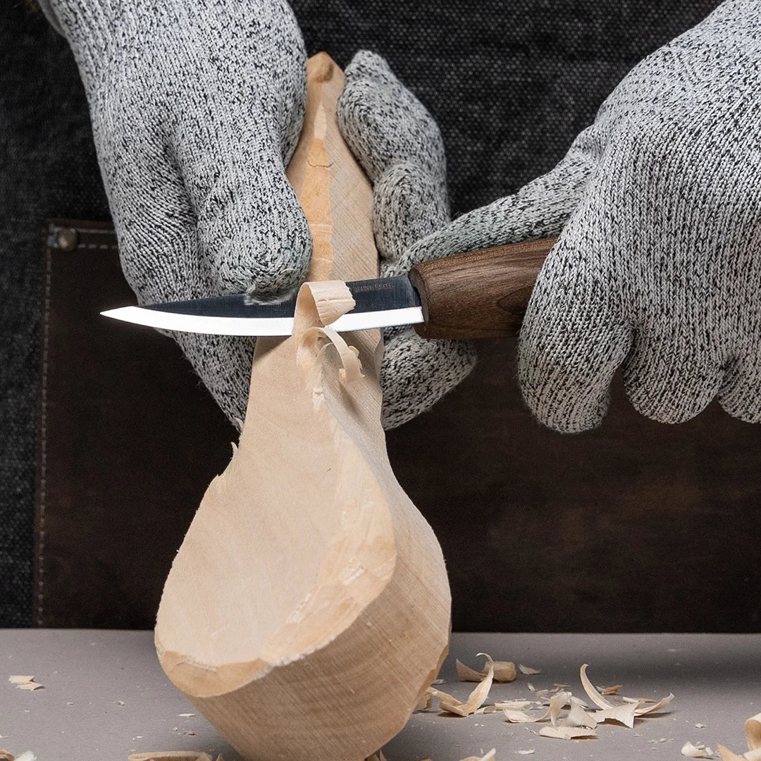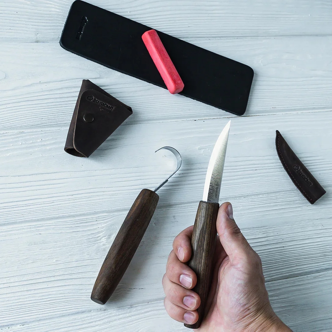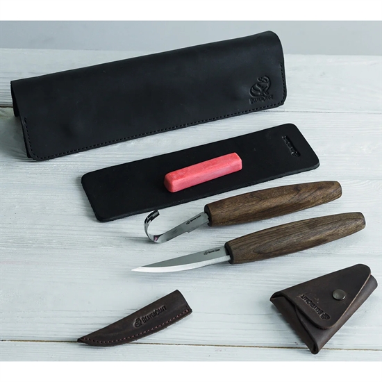 Kjernen i dette settet er to uunnværlige kniver: en snittekniv for fjerning av tre og detaljskjæring, samt en skekniv for utskjæring og skapning av intrikate riller. Disse knivene er dyktig laget av høykarbonstål og leveres barberbladskarpe, klare til å omskape dine idéer til virkelighet.Verktøyene har håndlagde håndtak av europeisk valnøttre, som er ergonomisk designet for et behagelig grep og utstråler sofistikasjon og klasse. Hvert strøk du tar med disse verktøyene er et vitnesbyrd om sammensmeltingen av kunstneri og funksjonalitet.Men det er ikke alt – settet leveres med viktige tilbehør, inkludert sikkerhetstape, en lærstropp og en poleringspasta. Alt du trenger for å begynne ditt skjære-eventyr er rett ved hånden og sikrer en problemfri og underholdende prosess.