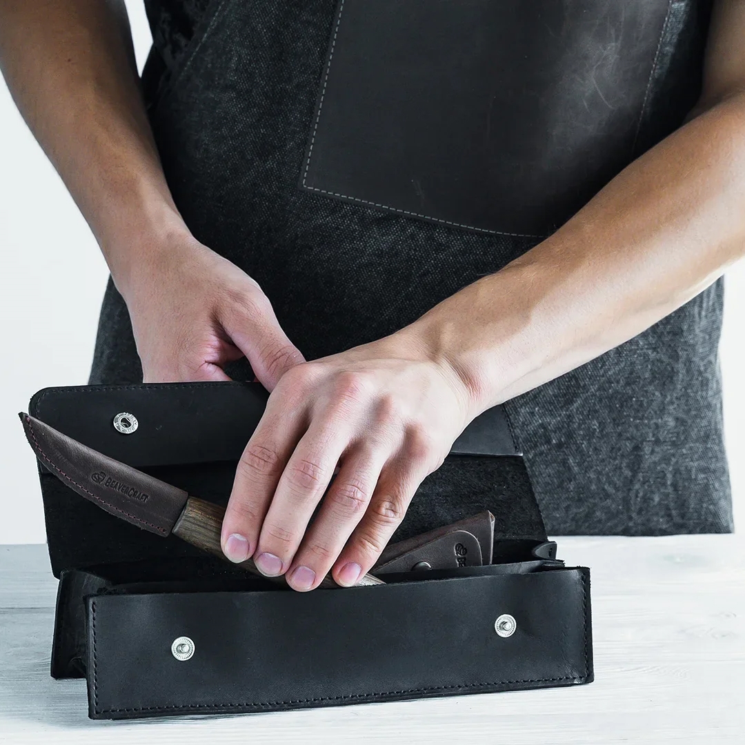 For å holde verktøyene dine trygge og stilfullt organisert, har vi inkludert en holdbar rullepose laget av høykvalitetslær, i en vakker brun nyanse. Den beskytter ikke bare dine verdifulle verktøy, men legger også til et snev av eleganse til dine skjæreprosjekter. Denne posen gjør det enkelt å lagre og transportere settet ditt, uansett hvor din kreativitet fører deg.