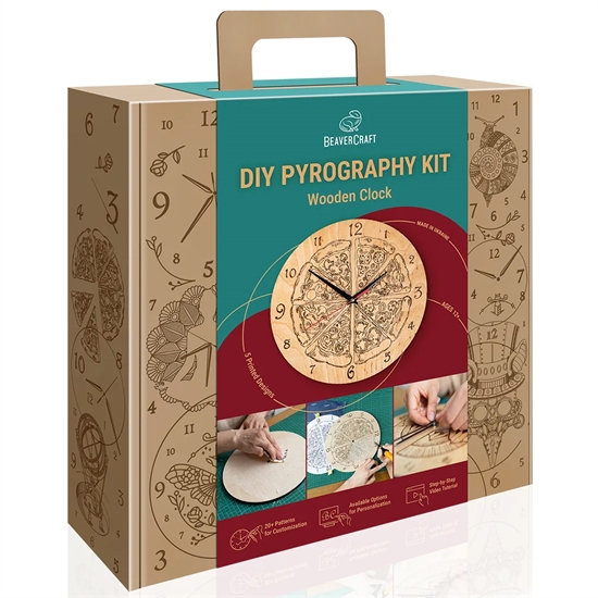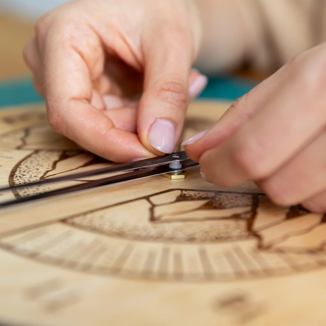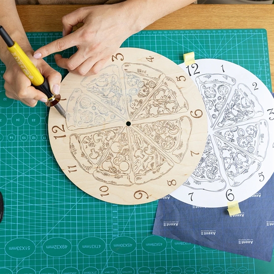Selve urskiven er en treplate med 28 cm diameter og 8 mm tykkelse. Det medfølger også en øvingsplate, slik at du kan teste temperatur og strøk før du starter på det endelige motivet.
