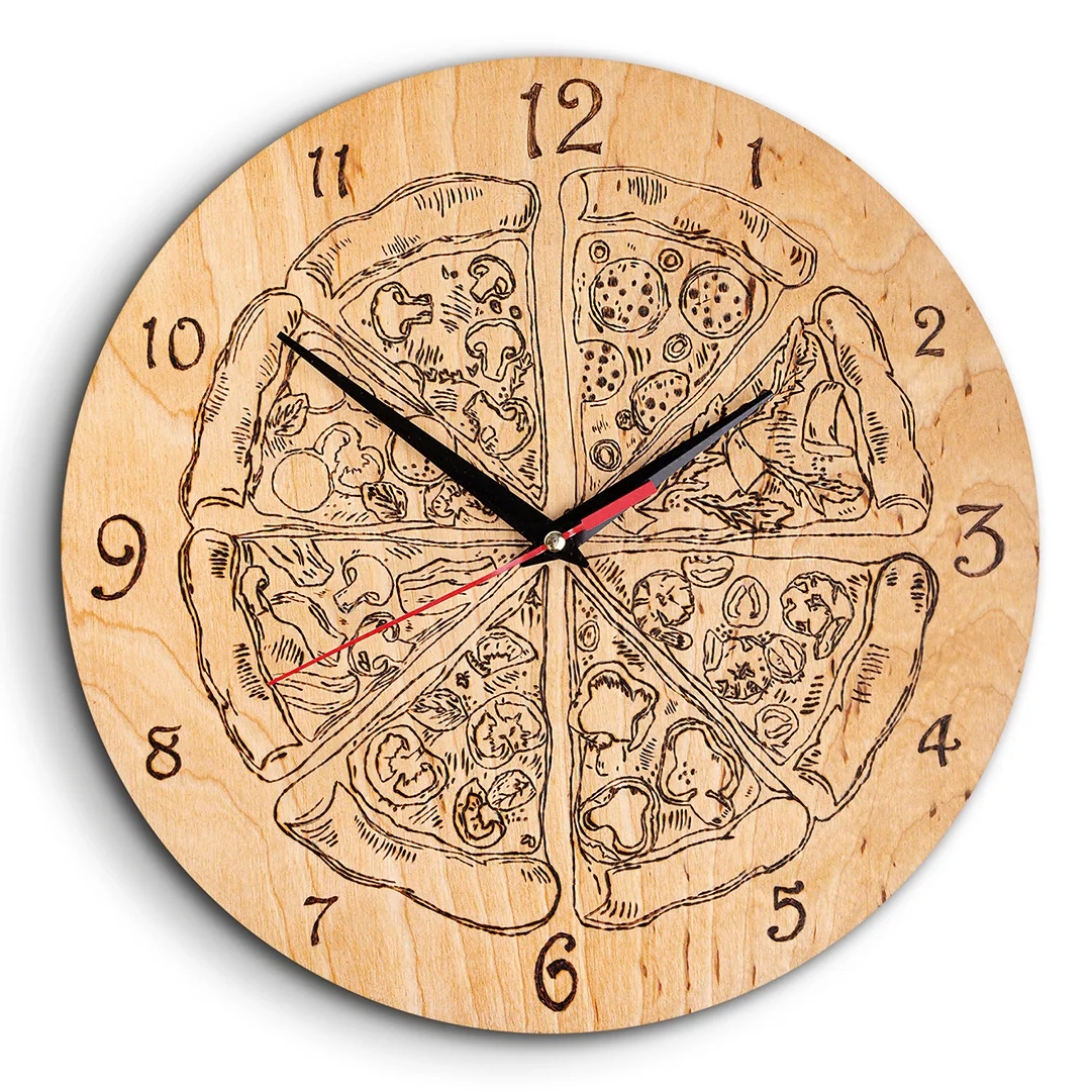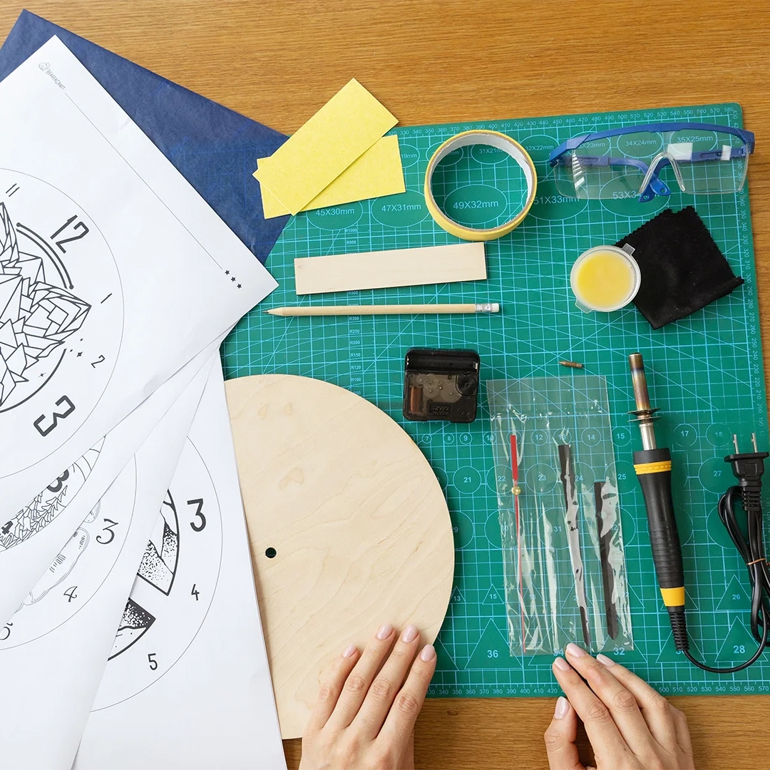 Settet inkluderer ferdige designmaler i A4-format, grafittpapir, sandpapir, blyant, trevoks til finish og urverk med visere. Instruksjoner følger med for korrekt montering og ferdigstillelse.