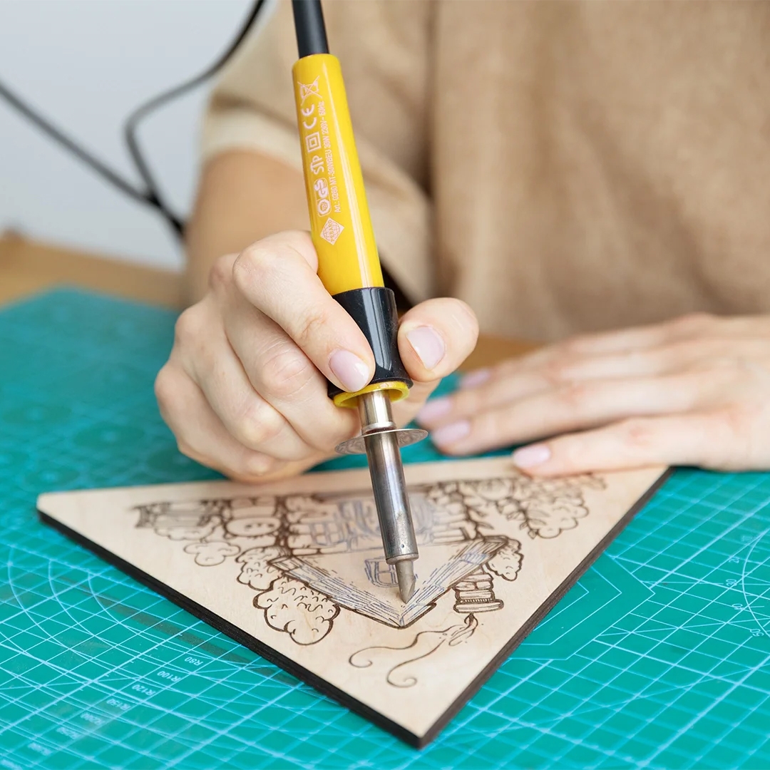 Verktøyet er en 30W brennepenn med to utskiftbare spisser. Den runde “pencil”-spissen egner seg for fine linjer og detaljer, mens den flate “feather”-spissen brukes til skyggelegging, skravering og struktur. Stativ til pennen følger med, slik at den kan ligge trygt under arbeidet.