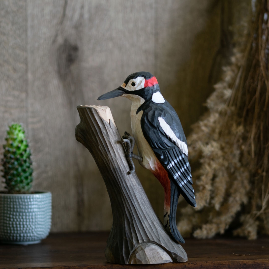 Denna naturtrogna hackspett är handskuren och handmålad med vattenbaserad färg och passar utmärkt som en naturinspirerad dekoration i vardagsrum eller uterum.