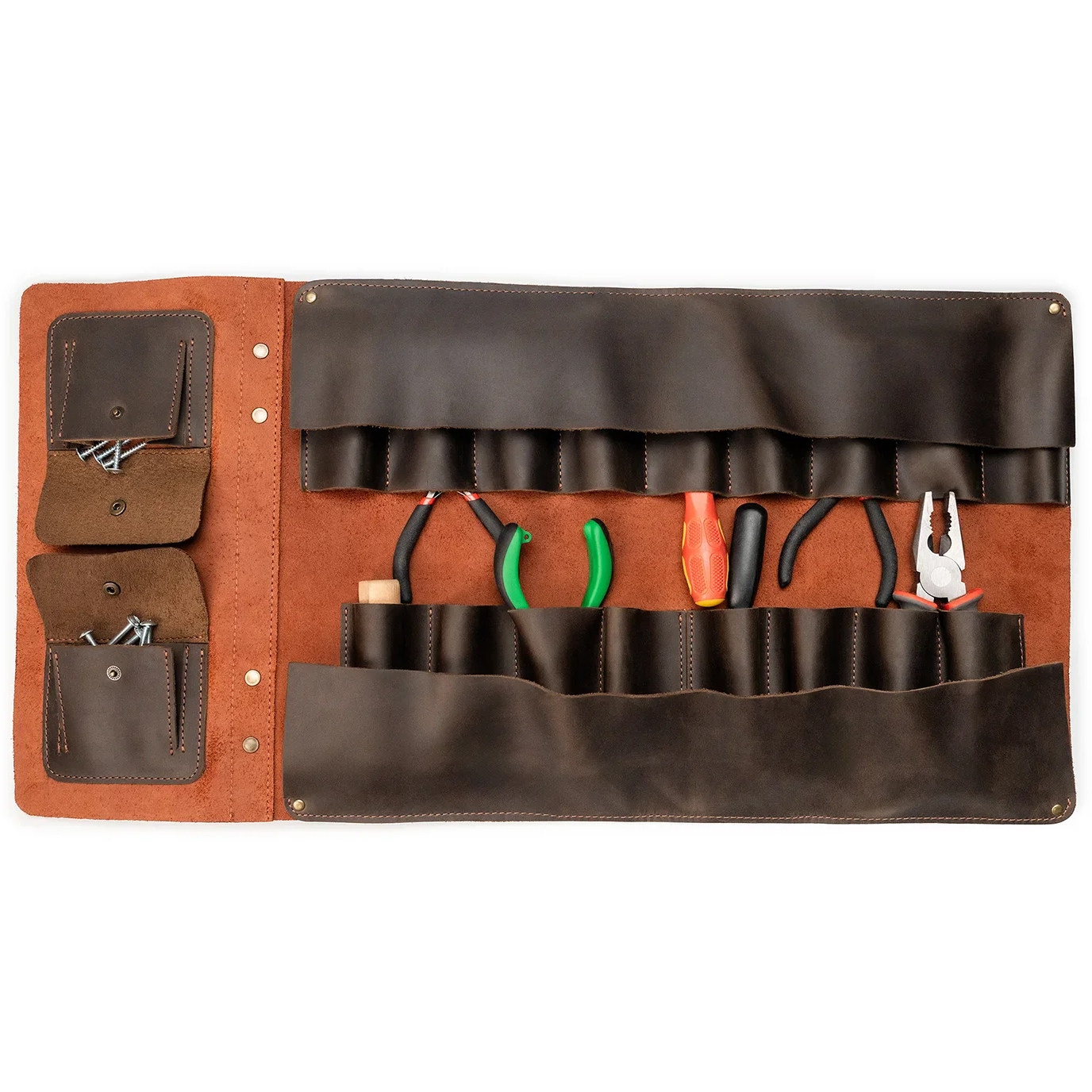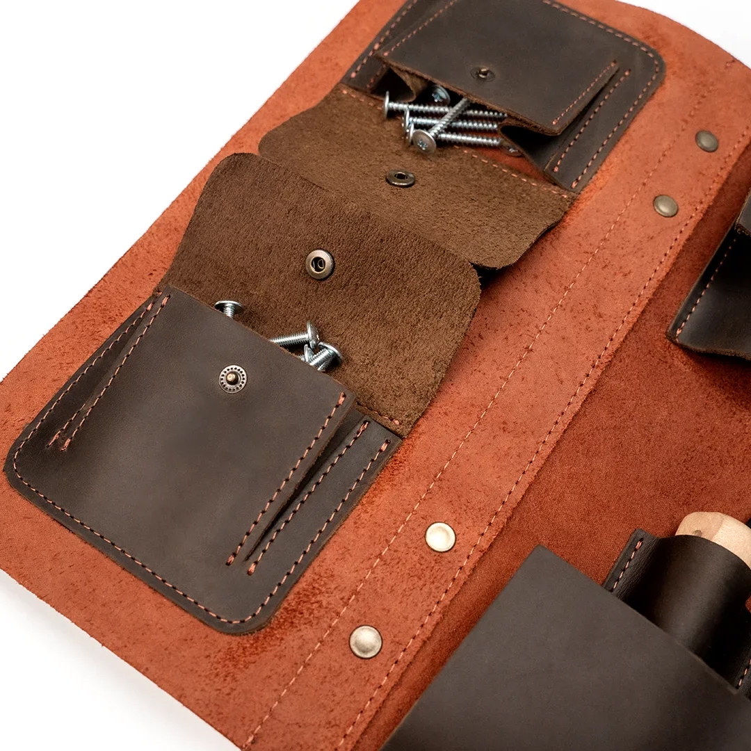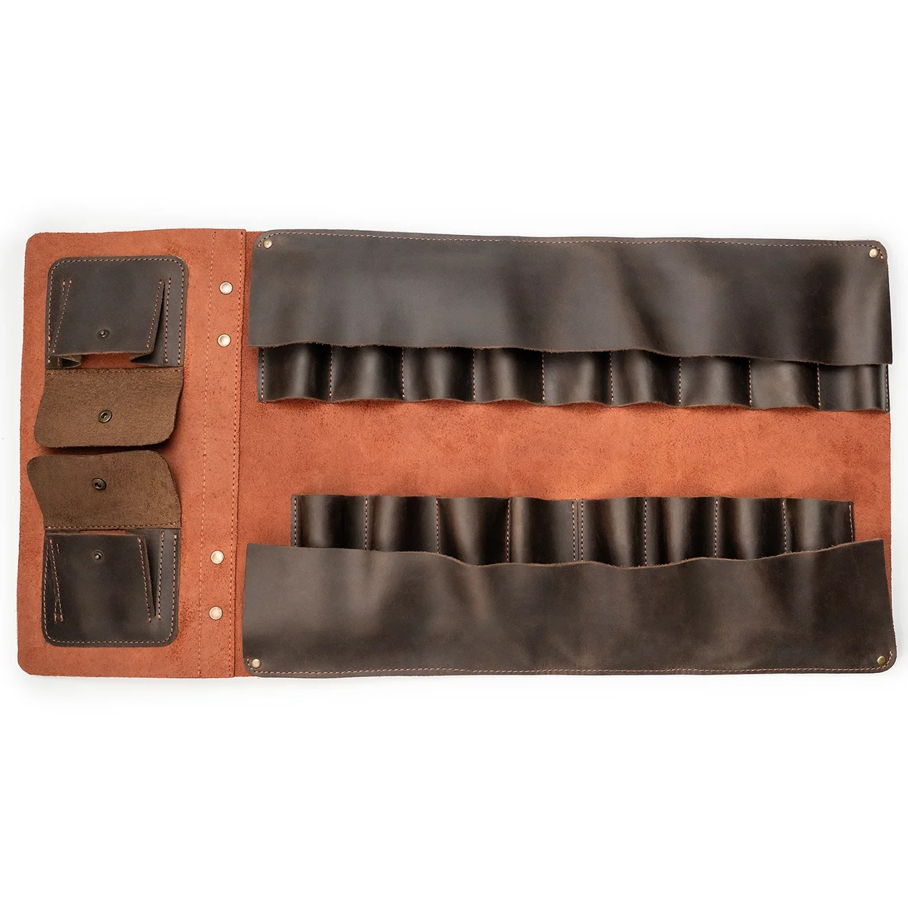 Laget av eksklusivt crazy horse-lær kombinerer denne verktøysrullen styrke og eleganse. Den mørkebrune utsiden signaliserer praktisk funksjonalitet, mens den lysere brune innsiden utstråler sofistikasjon. Den behagelige lærfølelsen tilfører en luksuriøs dimensjon til din daglige rutine, samtidig som materialets slitestyrke beskytter verktøyene dine effektivt.